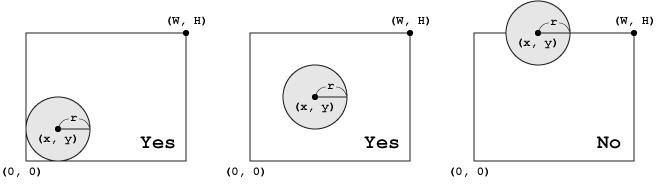 Five integers W, H, x, y and r separated by a single space are given in a line.